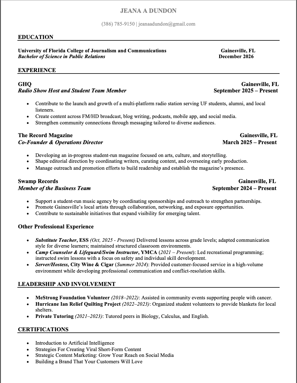 I am a Public Relations student at the University of Florida with a passion for building meaningful connections and crafting messages that leave a lasting impact. I thrive in collaborative, fast-paced environments where creativity and strategy come together to tell compelling stories. Outside of my studies, I enjoy exercising, reading, and exploring the world of fashion. When I’m not working on a project or learning something new, you’ll likely find me listening to music, spending time with friends and family, or pursuing other ways to stay active and inspired.