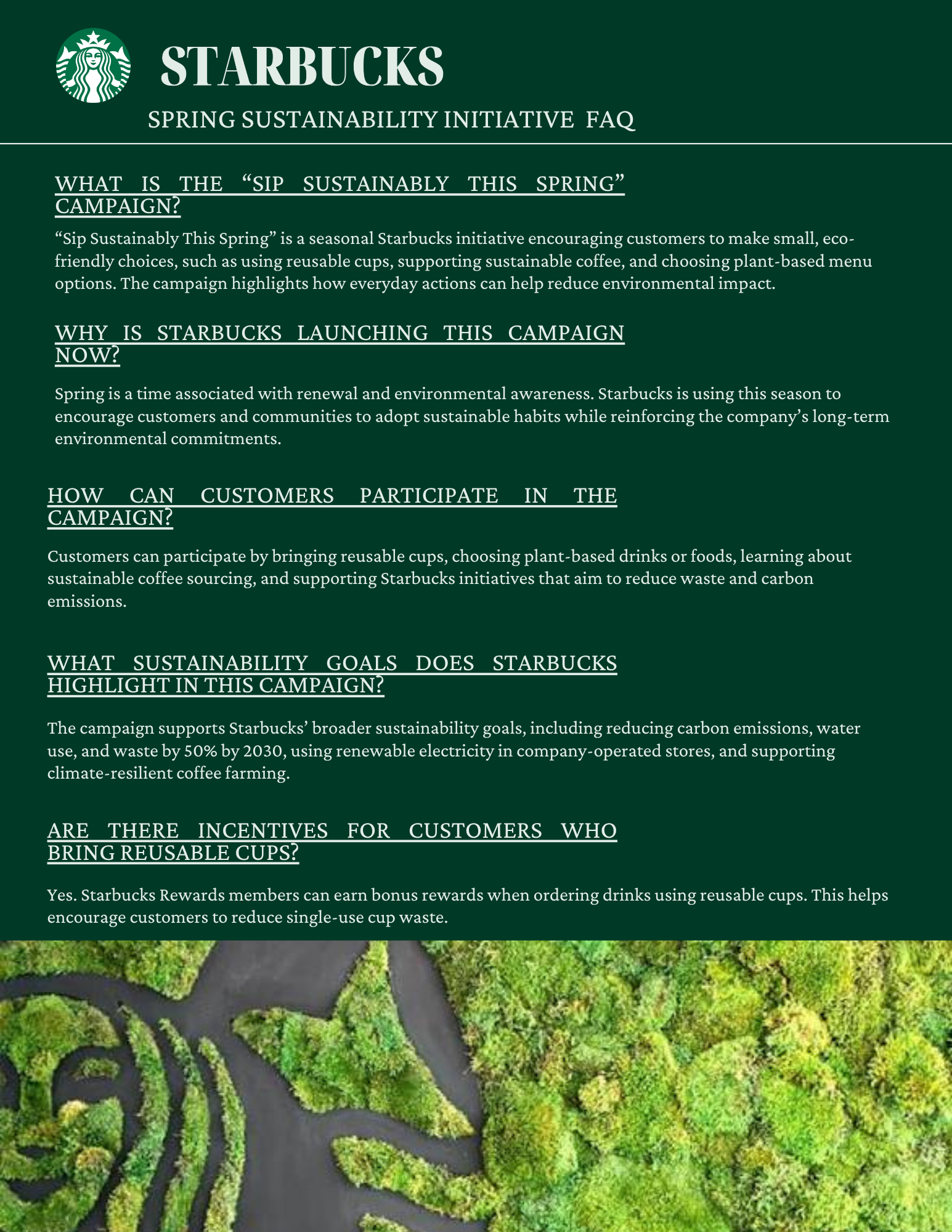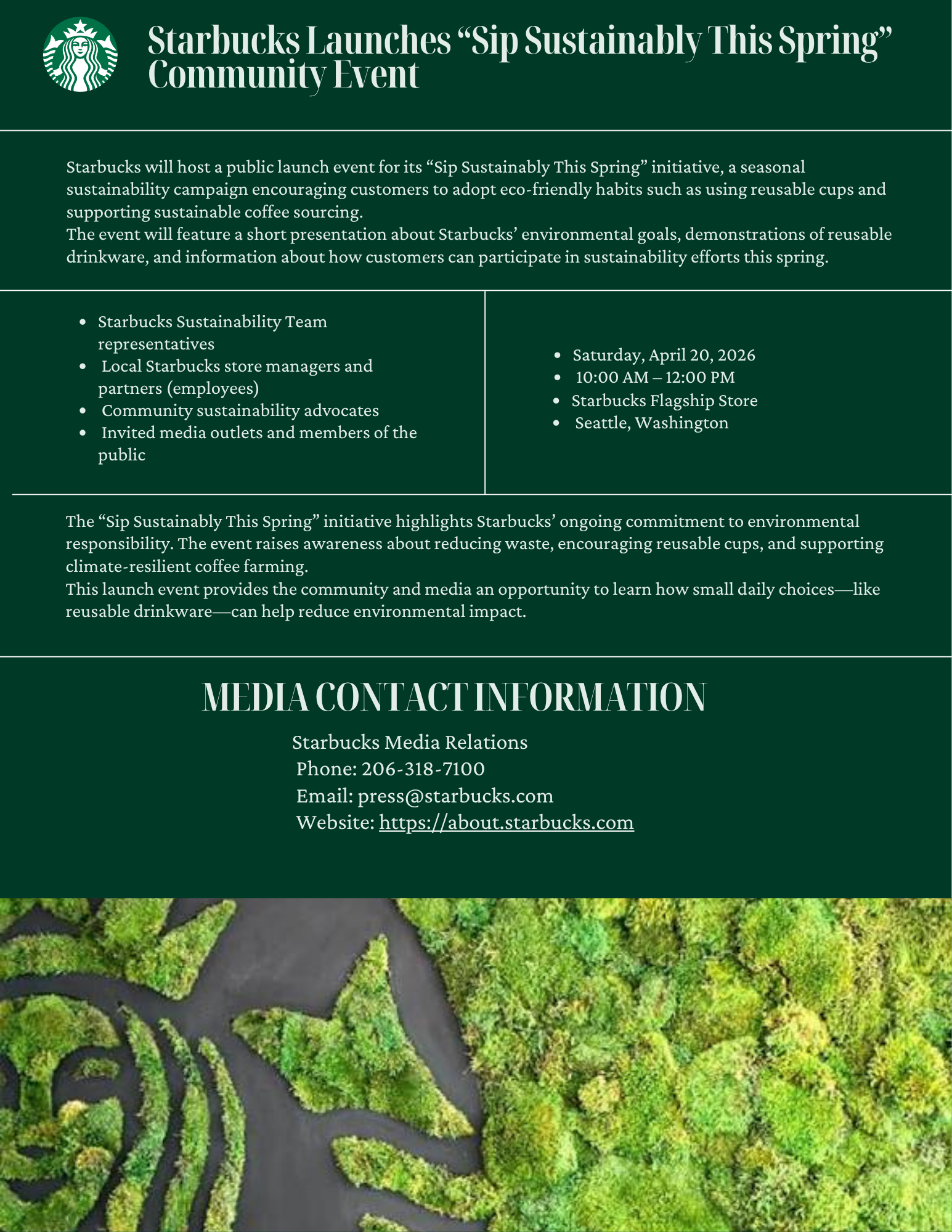 This media kit was developed as part of a public relations group assignment focused on promoting Starbucks’ Spring Sustainability Initiative.