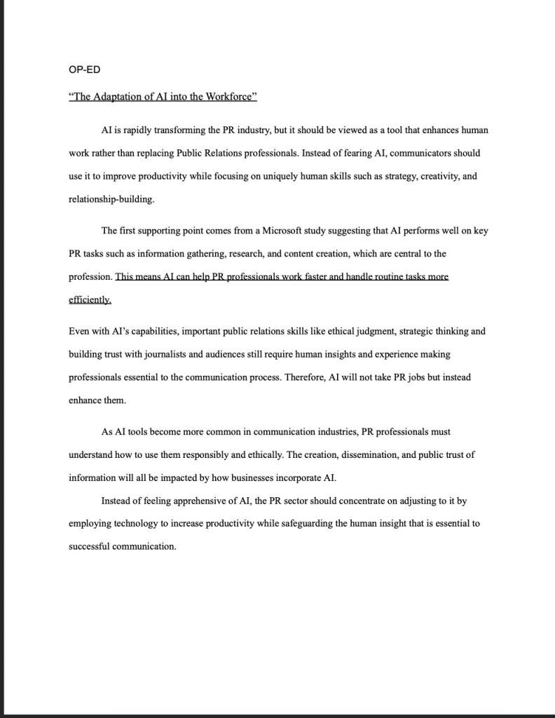 This op-ed was written as part of a public relations assignment focused on thought leadership and persuasive writing. The piece explores the growing adaptation of artificial intelligence in the workforce, addressing both its opportunities and challenges for businesses and employees. The target audience includes professionals, employers, and general readers interested in the future of work and emerging technologies. The strategy emphasizes a balanced, informed perspective, positioning the writer as a credible voice while encouraging readers to think critically about how AI can be integrated responsibly and ethically into modern workplaces.