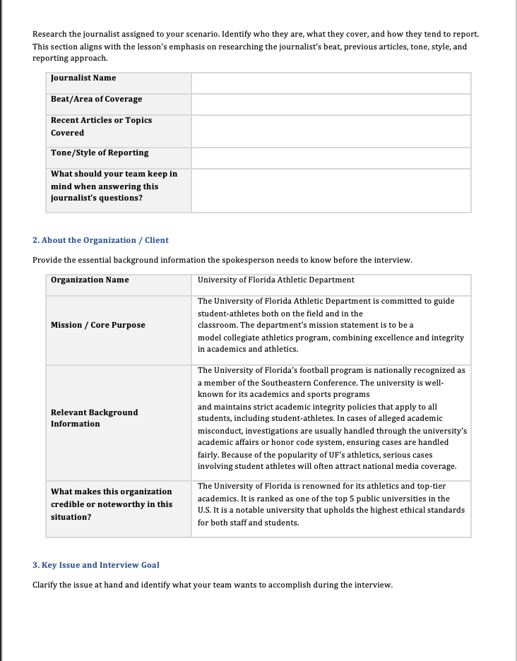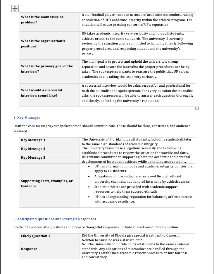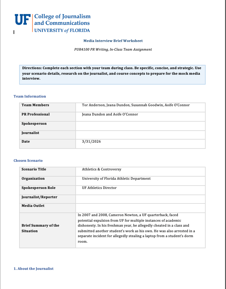 This media interview brief was created as part of a public relations assignment focused on athlete media strategy and message preparation. The brief centers on Cam Newton during his time as quarterback at University of Florida, with the objective of preparing key messaging, potential interview questions, and talking points for media appearances. The target audience includes sports journalists, fans, and stakeholders interested in team performance and athlete branding. The strategy emphasizes clear, confident messaging that highlights leadership, performance, and personal brand development while ensuring consistency and professionalism across media interactions.