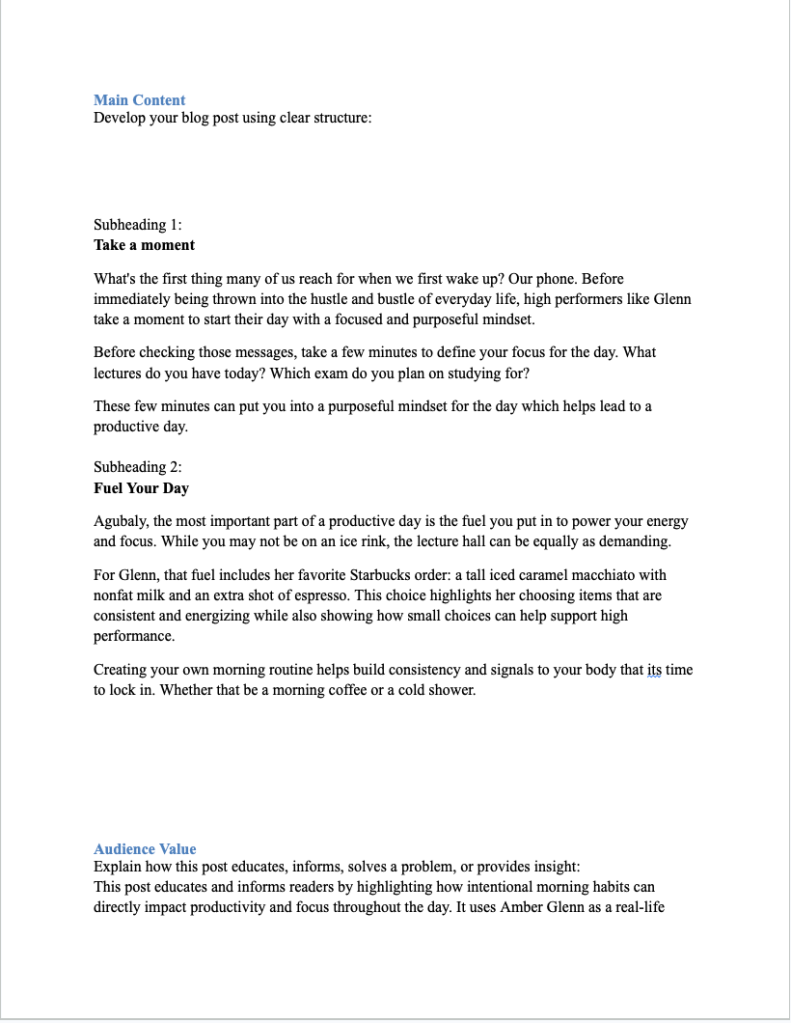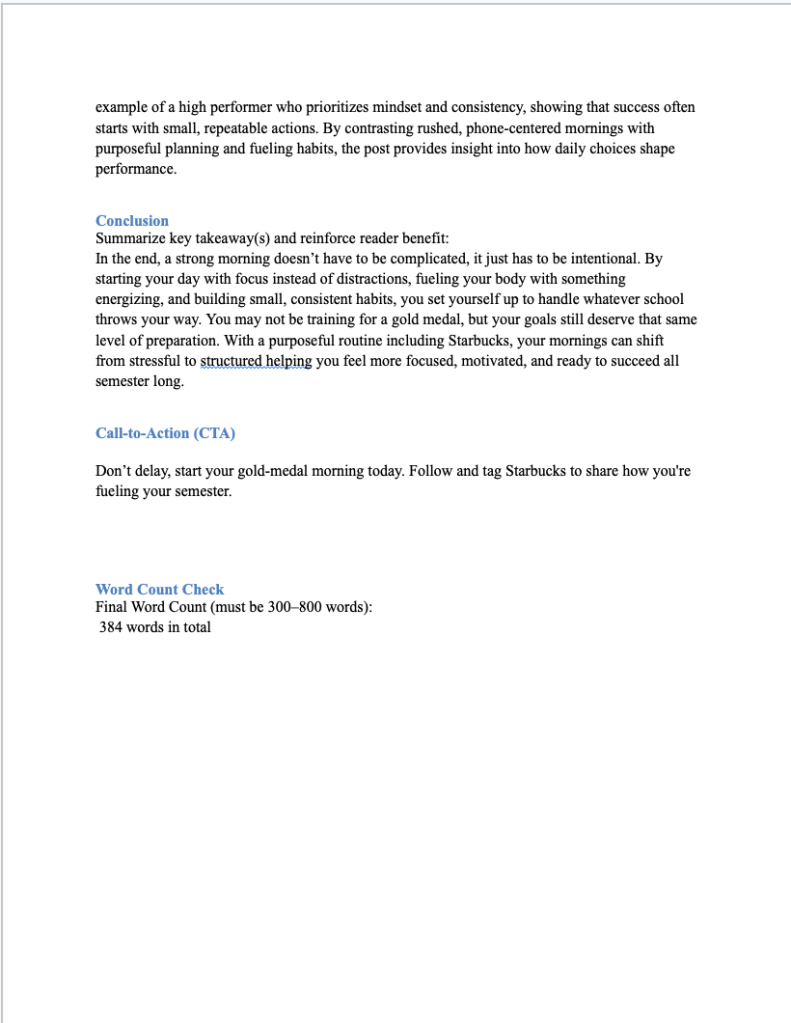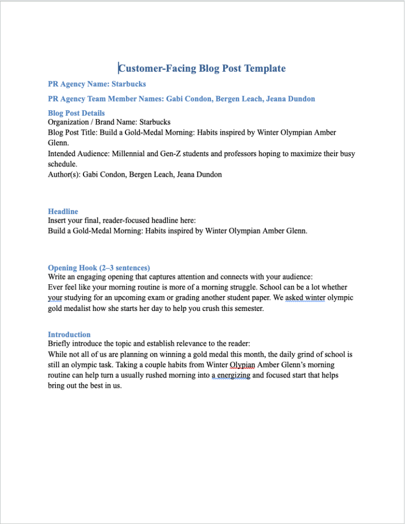 This customer-facing blog post was created as part of a public relations assignment focused on lifestyle branding and content marketing. The goal was to engage millennial and Gen Z students and professors by connecting Starbucks to everyday productivity and morning routines. The post uses Winter Olympian Amber Glenn as an example of high performance to highlight how intentional habits can improve focus and consistency. By linking these routines to Starbucks products, the strategy positions the brand as part of a simple, energizing start to a busy academic day.