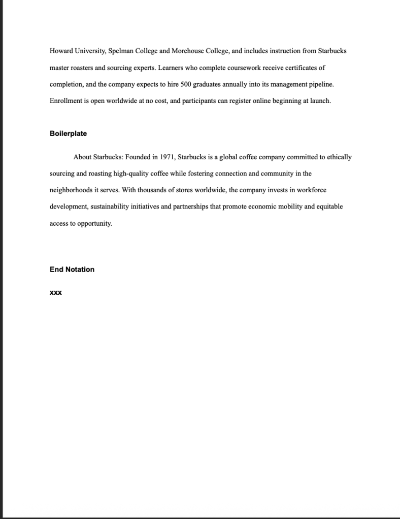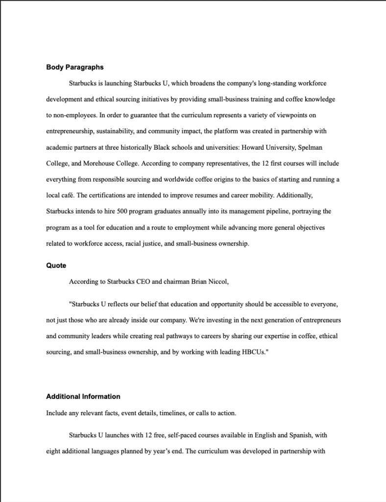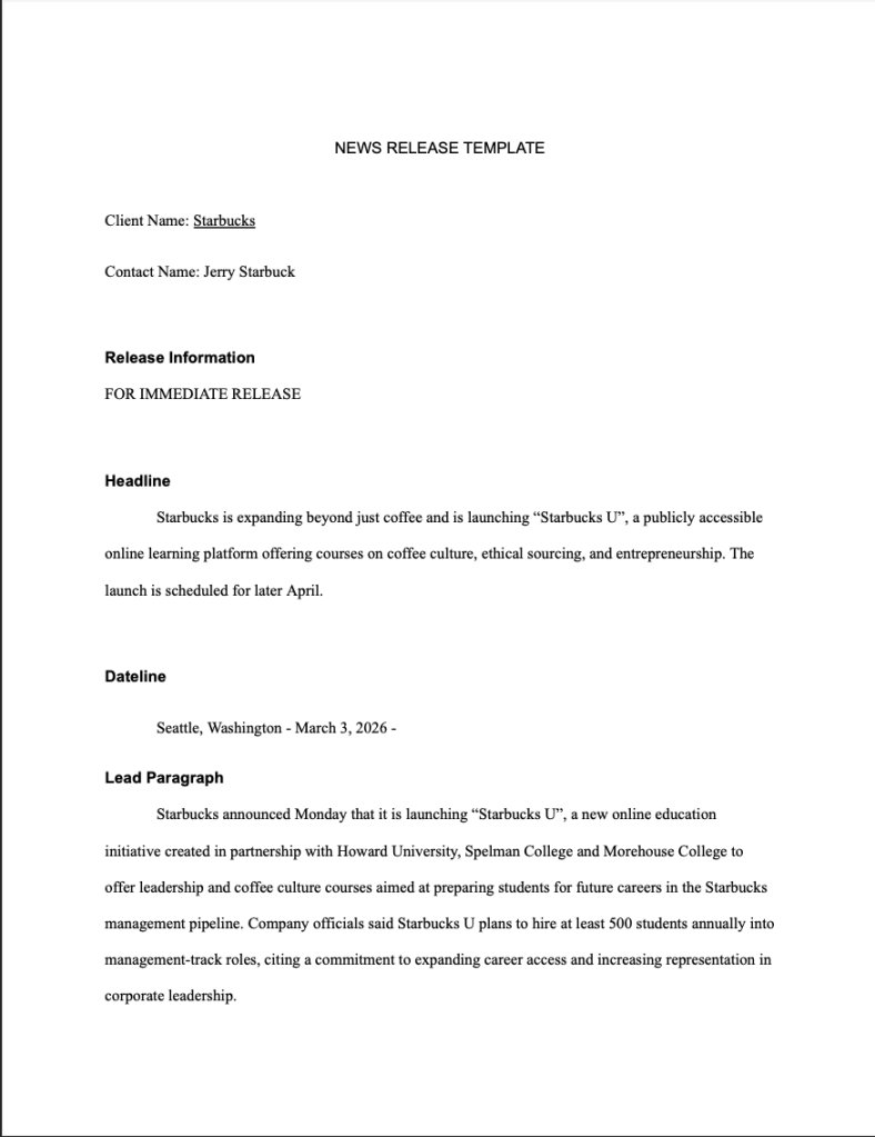 This news release was created as part of a public relations assignment focused on corporate communication and brand expansion strategy. The objective was to announce the launch of “Starbucks U,” an online learning platform designed to position Starbucks as a leader in education, workforce development, and social impact.